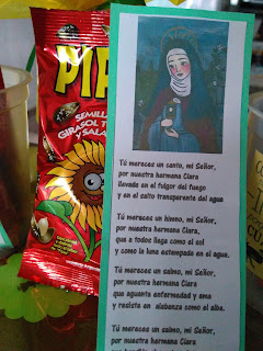 Santa Clara de Asís. Flor de girasol. Virtud "Fe en Dios". Color Amarillo. Manualidad: broches con imán para la heladera, y corazones con frases de Santa Clara.