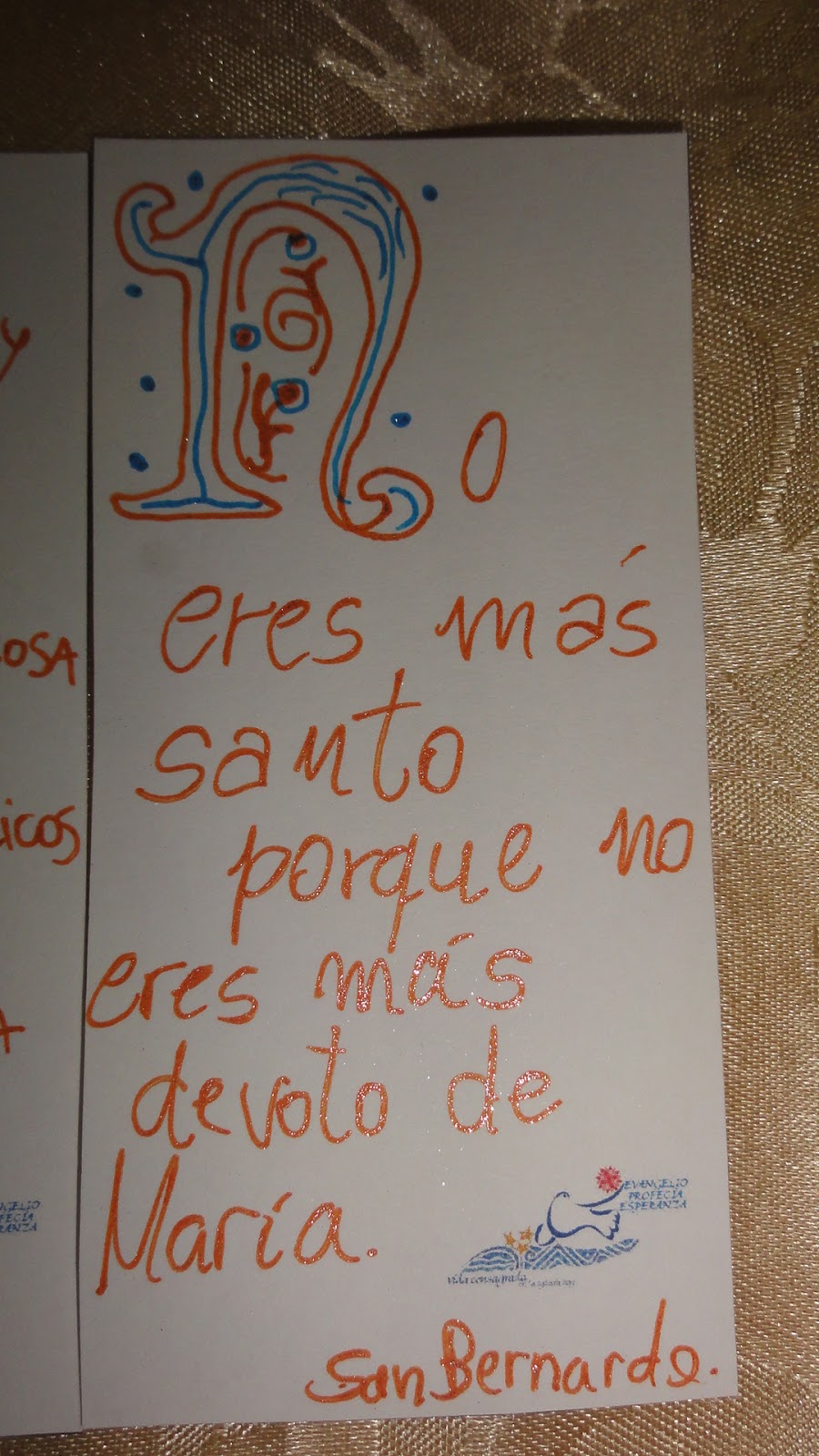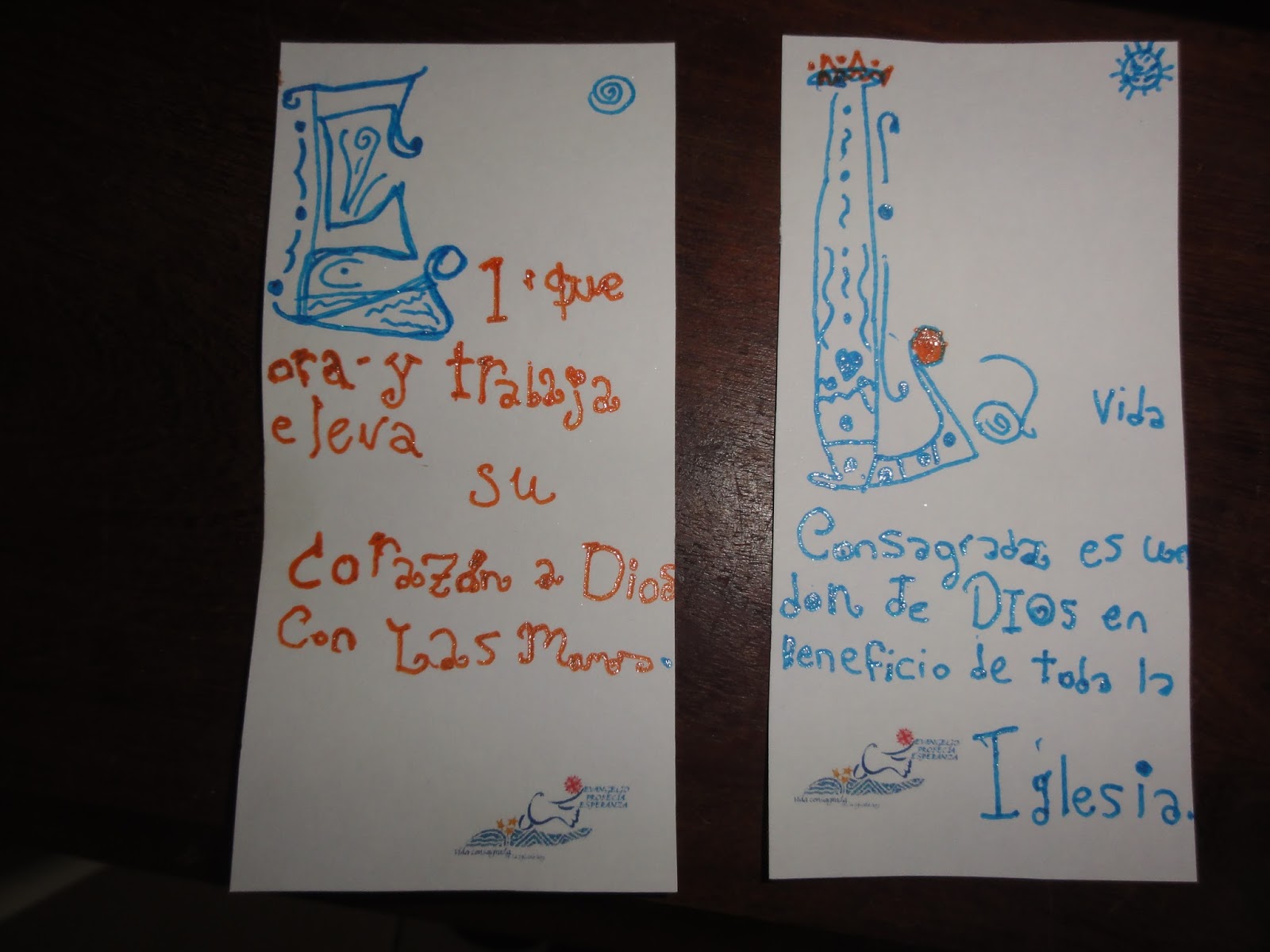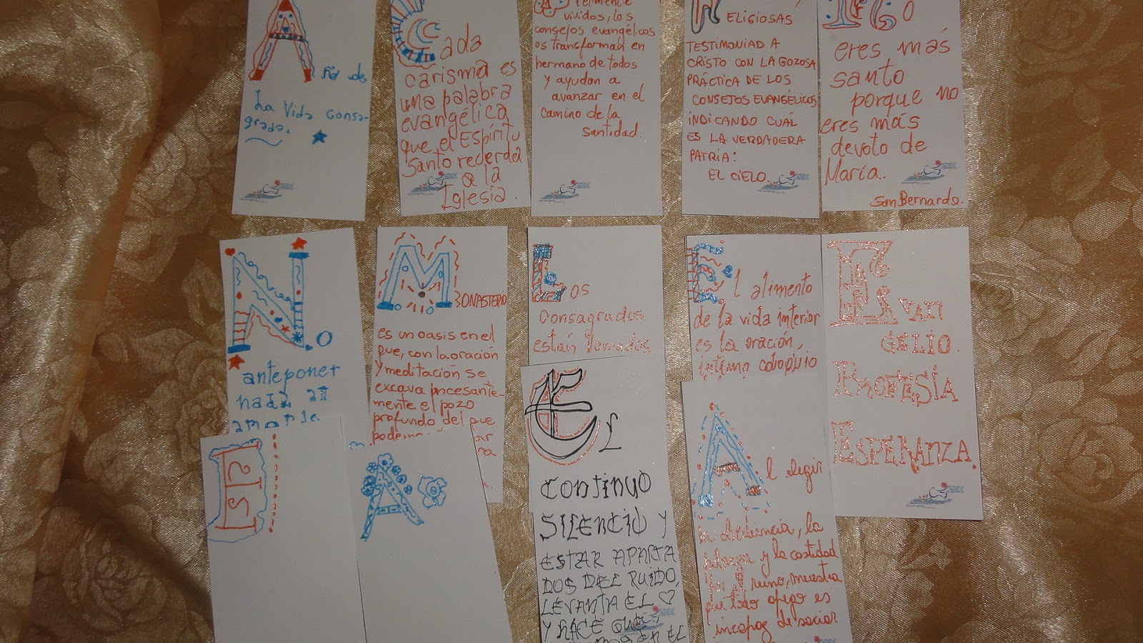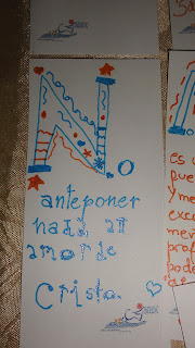 Les cuento como lo hicimos. utilizamos word, con cuadro de texto diseñamos el tamaño de los marcapaginas, le agregamos el logo bien pequeñito abajo. Luego buscamos en internet "alfabeto uncial", copiamos varios en word, una vez que elegimos las frases fuimos recortando (con la opción recortar de word) la letra del comienzo, llamada letra capitular. Una vez que estaba sola la ampliamos y asi las fue copiando mi hija con las biromes de brillito y microfibras, quién tenga mas destreza con plumones o marcadores biselados puede hacer un trabajo más prolijo y profesional. Incluso se puede vender, esto es solo recreativo y para regalar.