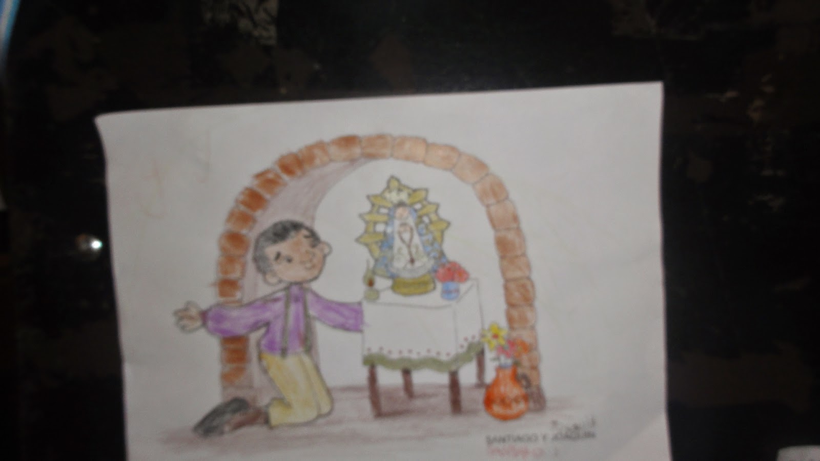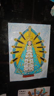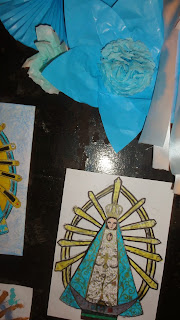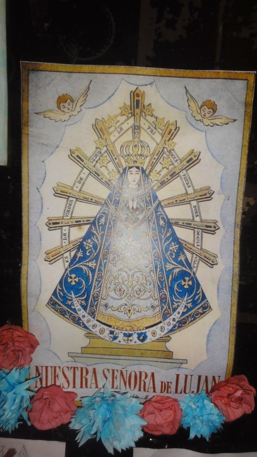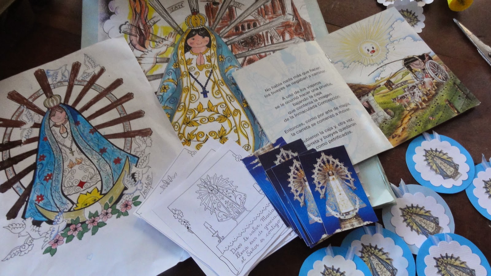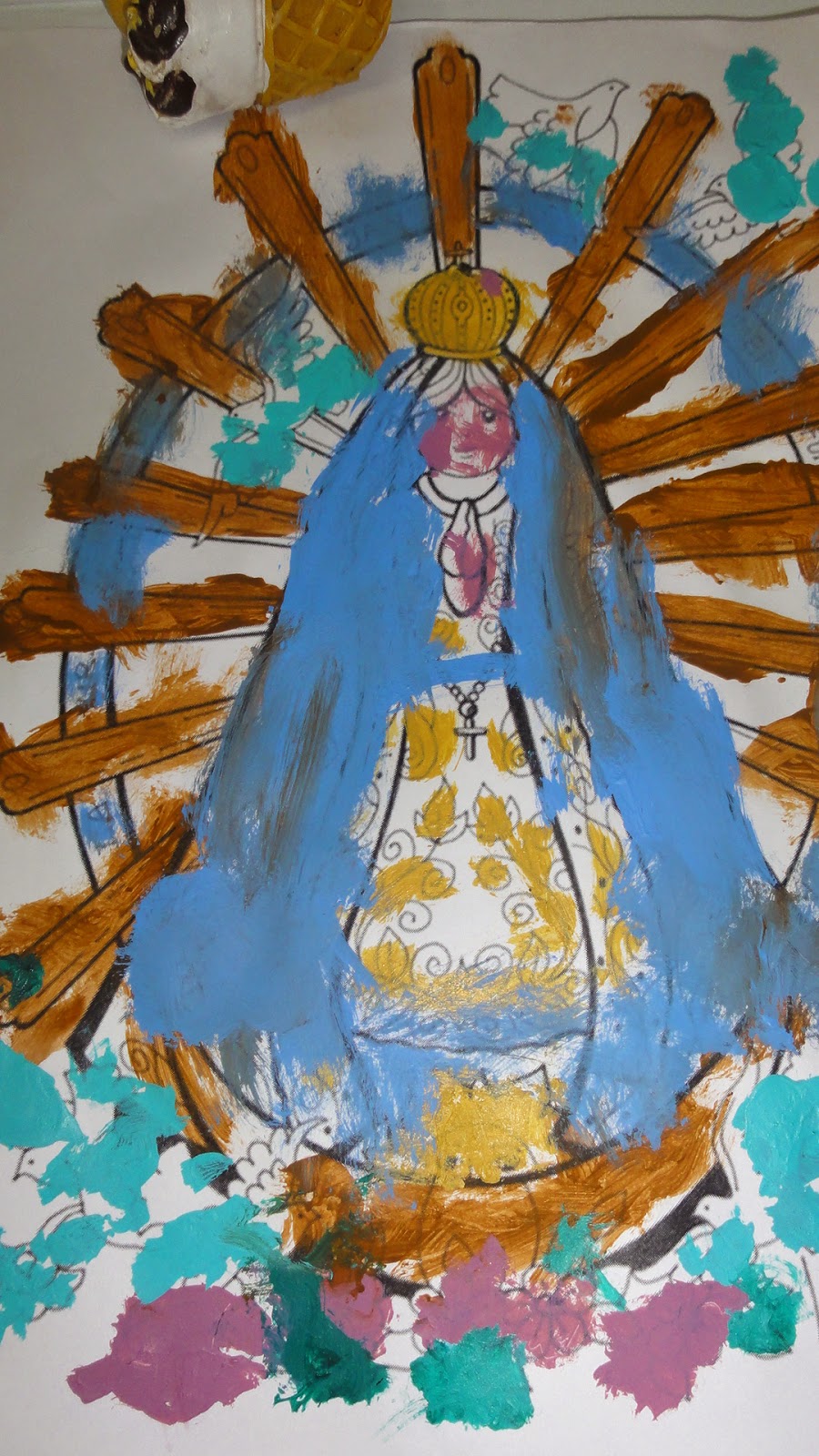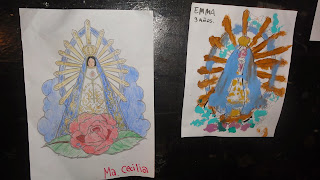 El trabajo en casa consistió en observar la imagen los colores, el significado de cada cosa, quien es María (Nuestra Madre), por qué es de Luján (porque en un suceso milagroso se quedó en un paraje junto al río Luján) en nuestro país, qué características distintivas tiene la imagen, (manto celeste con decoraciones doradas, corona, detrás una rayera que representa el sol, debajo una media luna con escudos) debajo de ese vestido es una imagen de la Inmaculada Concepción.
