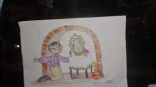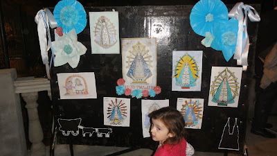 Como grupo de familias pensamos una pequeña actividad con los mas chicos, fue decorar la cartelera, cada niño en casa pintó una imágen para colorear y el día de la fiesta fue colocada junto a una imágen central, flores, cintas celestes y blancas y algunos símbolos, como la carreta y los bueyes, también la basilica.