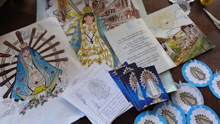 este año en la parroquia fue muy especial ya que le cambiamos el manto a la imagen, se renovó la rayera (esa especie de sol que tiene detrás) y la corona. La ceremonia fue muy dulce y emotiva. Luego con el antiguo manto hicimos estampitas con la reliquia, es decir fue recortada en pedacitos y pegada en una estampa para regalar a cada fiel el día de la fiesta patronal.