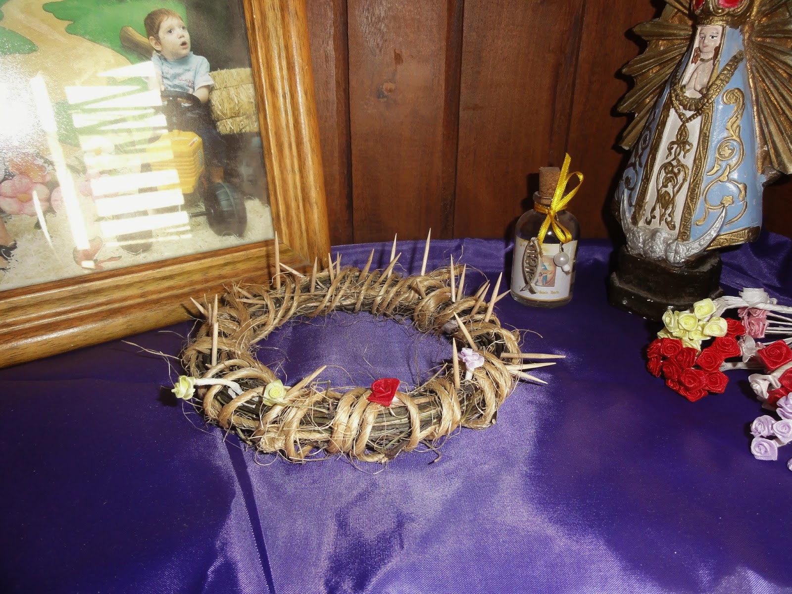 Este año no realicé la corona de espinas para reemplazar con flores, fue a mi pesar pero es algo que viene costando y busqué otras formas de incentivar a los sacrificios y esfuerzos. Hicimosuna corona con espinas verdaderas de gran impacto visual.