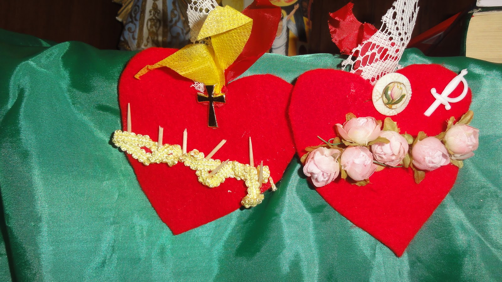 Realizar los corazones de Jesús y Maria ver similitudes y diferencias, hacer cada detalle, las espinas con pedacitos de palillos, las flores artificiales, una espadita de plástico, una crucecita de madera o de algún rosario que se rompió…en santerías se consiguen de madera muy económicas, el fuego con tela o papel de seda. Colocarlos en el altar y entregarles nuestro corazón.