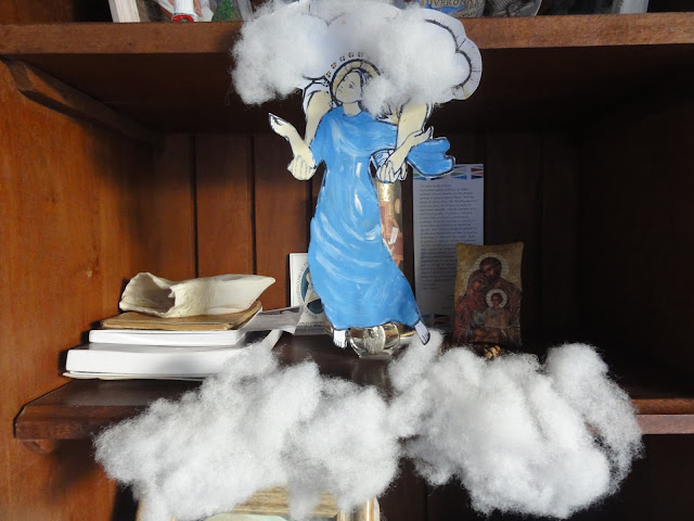 Pintar una imagen de Maria con acuarelas (me gusta especialmente la que está con otras manos asomando del cielo y la llevan) mostrar la diferencia entre ascensión y asunción. Colocar la imagen el altar con velloncitos formando nubes. Rezar el misterio glorioso correspondiente.