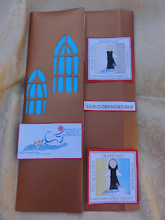 El lapbook por fuera tiene las mismas imagenes que el de Mariuxi sobre los Benedictinos (de hecho están bastante emparentados) tiene además dos ventanas caladas ya que muchas páginas que visité tienen fotos con sus largos ventanales luminosos y despojados de dibujos, también por el hincapié que hacen en la importancia de la luz, el agua y las flores para un monje, o monja. El color es marrón inspirado en el color de la página principal sobre los cistercienses (O.C.S.O.) y con letras góticas que son "casi" invento de ellos, las encontré en la pagina de fuentes DAFONT opción Gótico- medieval.